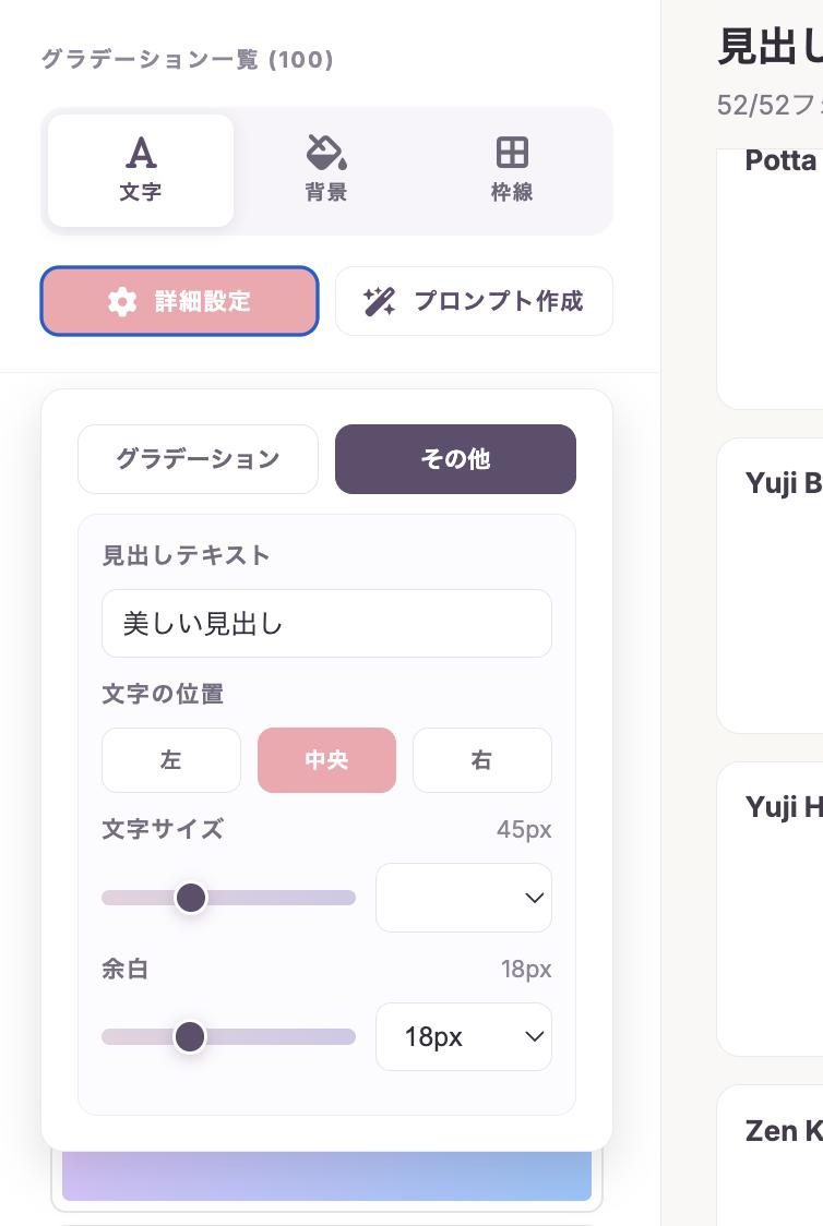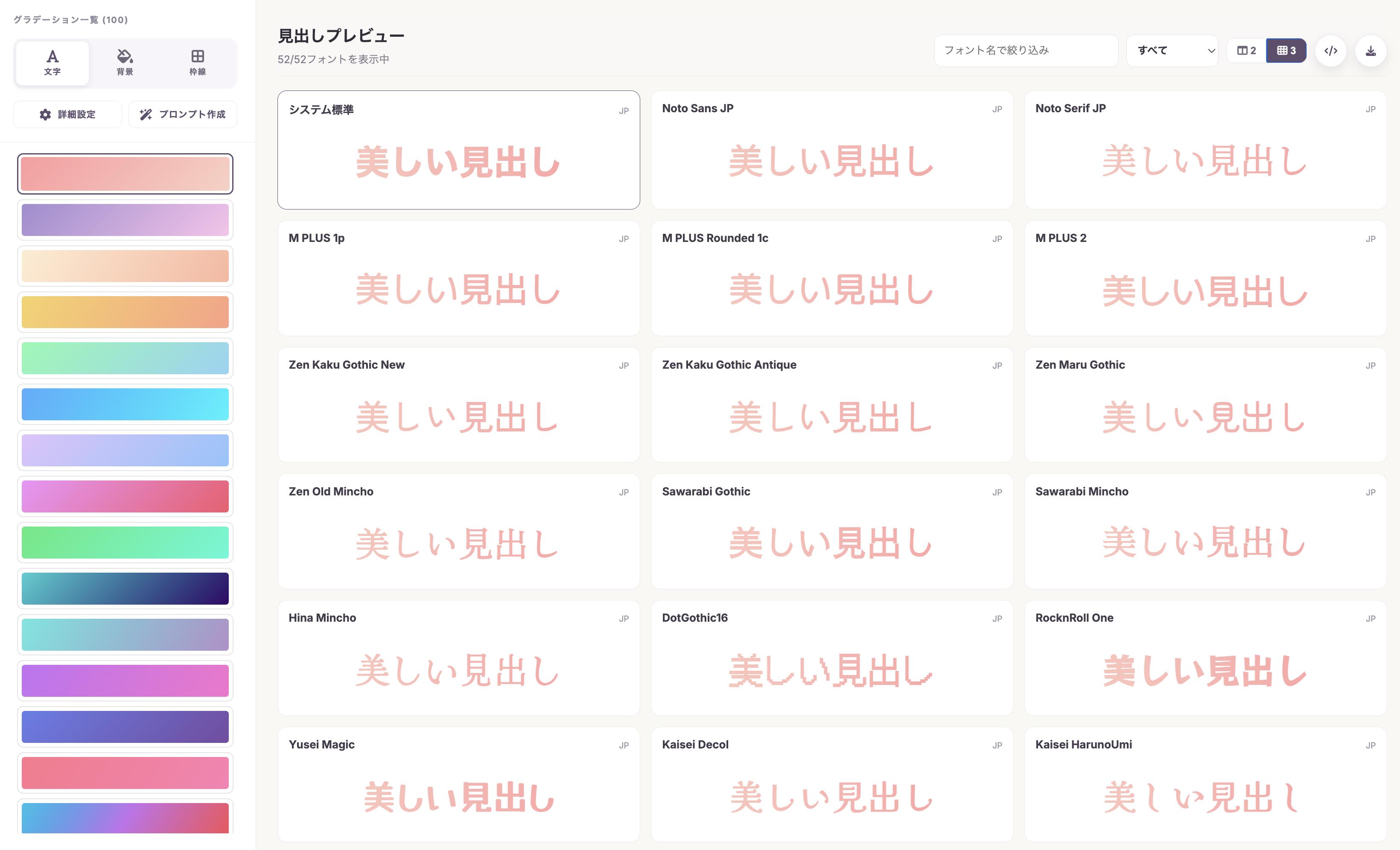 52種類の日本語Googleフォントを一覧でプレビューしながら、文字や背景、枠線にグラデーションをサクッと適用できる見出し生成ツールを作りました作りました。