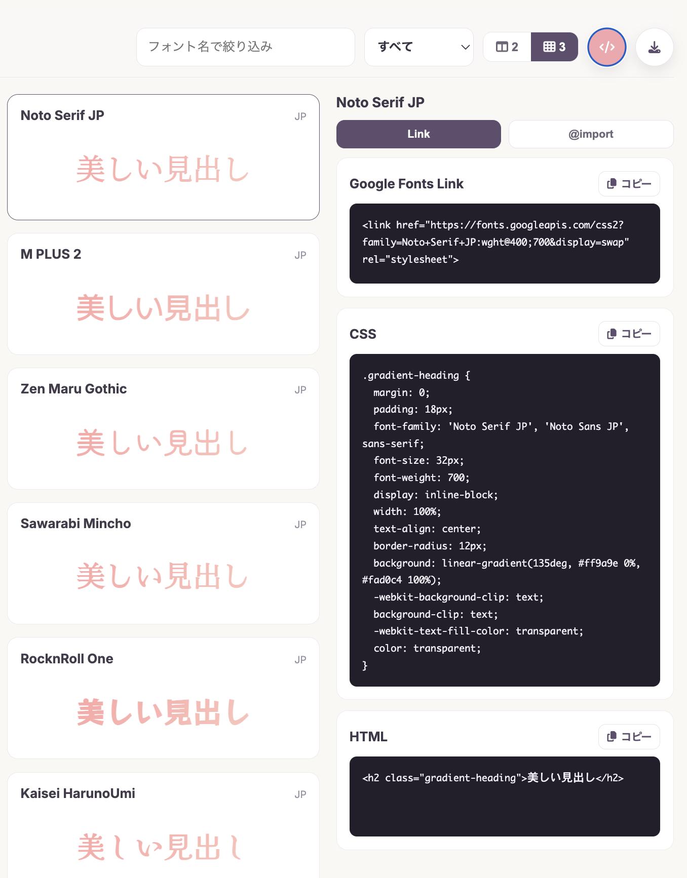 フォントを選択すると、画面右側にコードパネルが表示されます。「Google Fonts Link」「CSS」「HTML」のコードが表示されるので、「コピー」ボタンを押して使用してください。