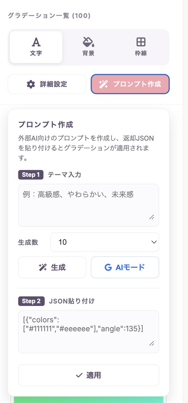 生成されたプロンプトをChatGPTなどに入力して実行します。AIから出力されたJSON形式のデータをツールの「JSON貼り付け」欄に入力し、「適用」を押すと、新しいグラデーションが一覧に追加されます。