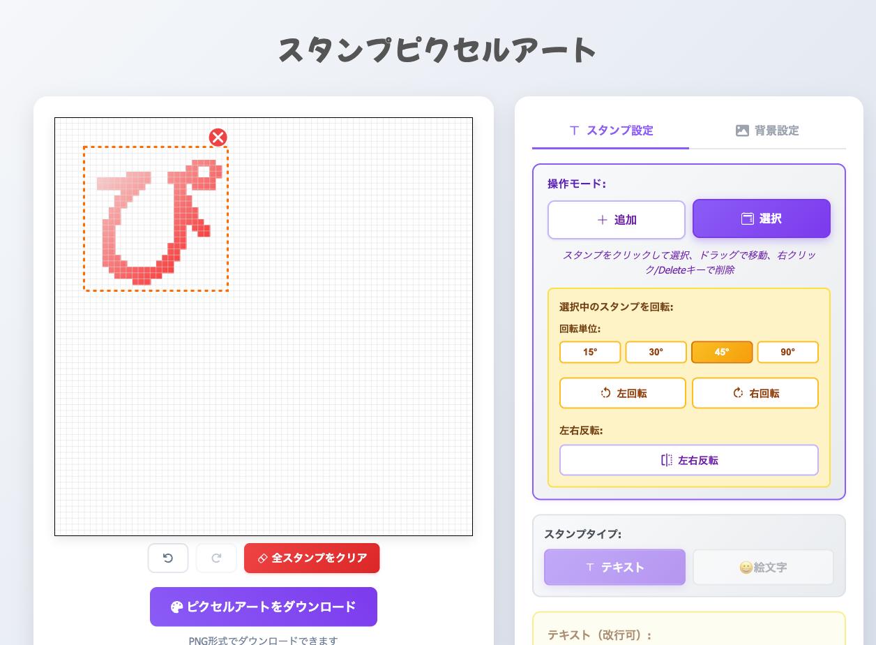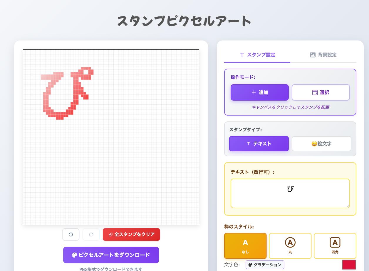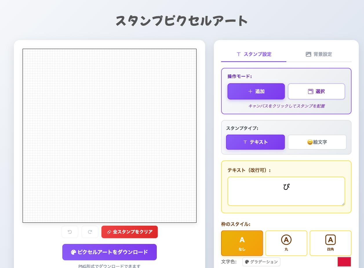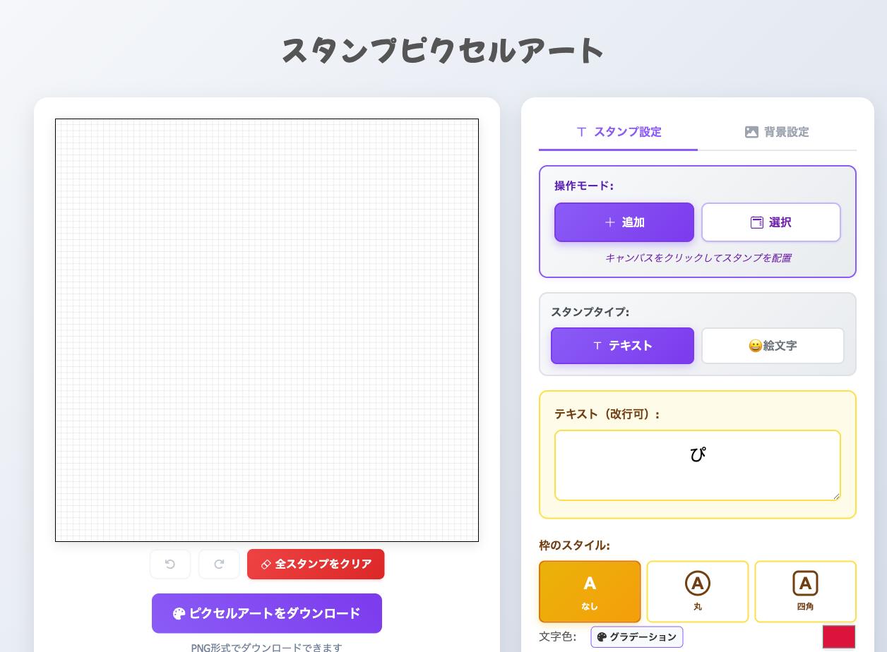 「スタンプピクセルアート」は、好きなテキストや絵文字をスタンプにして、キャンバス上に自由に配置できるWebツールです。