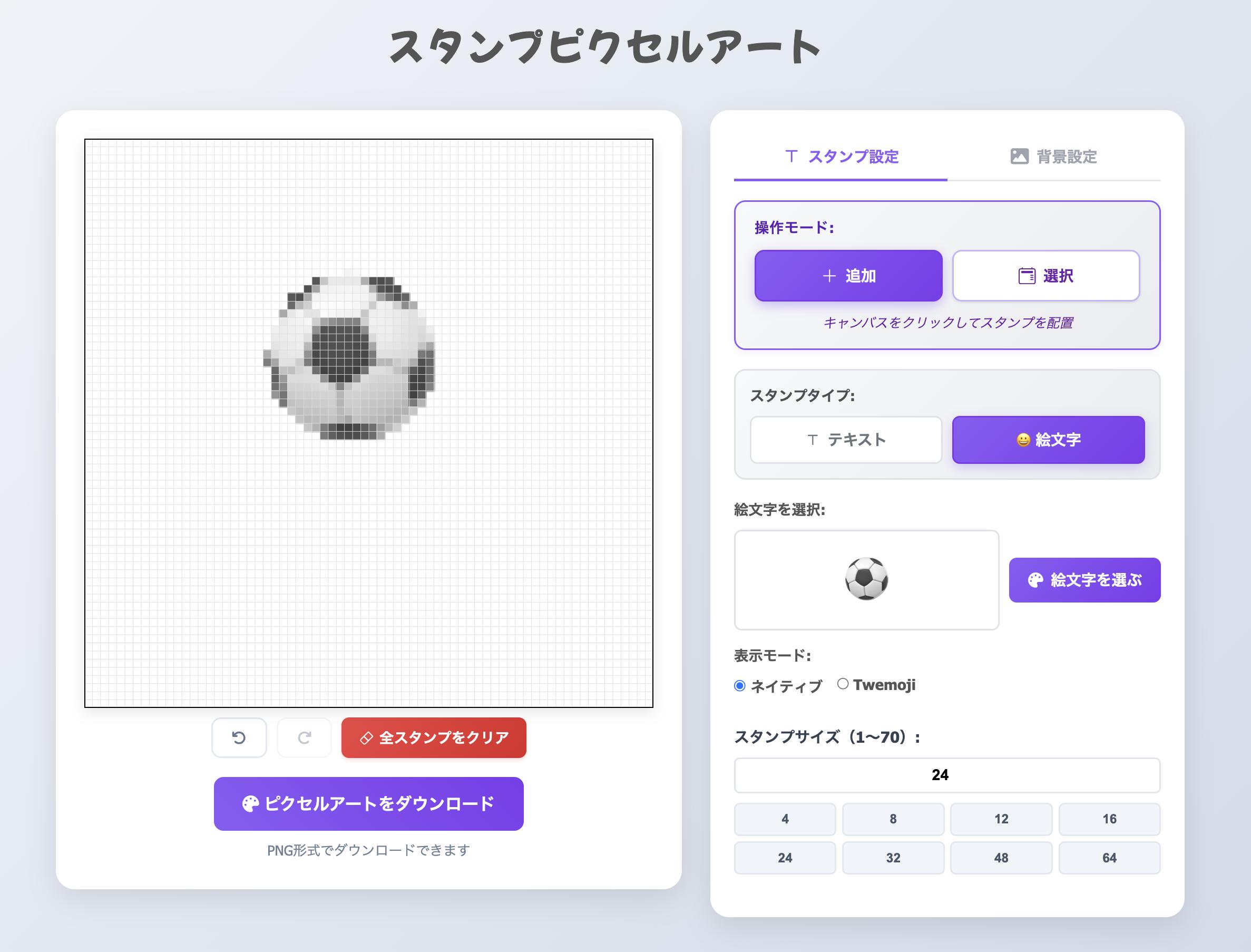 テキストや絵文字をスタンプのようにポンポンと配置して、誰でも簡単にドット絵風のアートを作ることができるツールです。